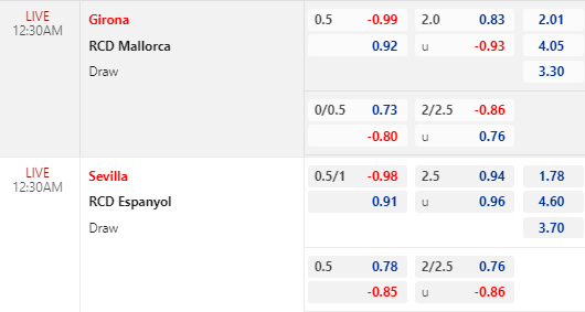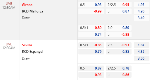 * Sevilla vs Espanyol: Sevilla mất giá khi tỷ lệ chấp 3/4 bị kéo về còn 1/2. Tài xỉu dù vẫn là 2 1/2 nhưng điểm ăn cho cửa tài lại tiến đến mức bỏ. Trước đối thủ đang xếp áp chót và thua kém nhiều mặt, việc Sevilla mất giá là tín hiệu đáng lo ngại với cửa trên.