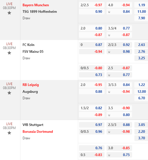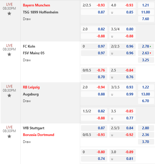 * Stuttgart vs Dortmund: Càng sát giờ bóng lăn thì Dortmund càng mất giá. Kèo chấp đồng banh của khách ghi nhận điểm bỏ sâu trong khi tài xỉu vẫn là 2 3/4. Dịch chuyển handicap như vậy rõ ràng không khả quan với Dortmund dù đối phương có vị thế kém hơn họ rất nhiều.