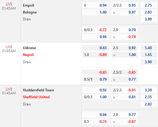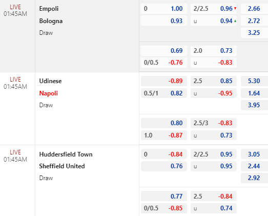 * Empoli vs Bologna: Tỷ lệ chính vẫn dừng lại ở mức 0:0 với điểm ăn thấp hơn cho cửa chủ nhà. Trong khi đó thì tài xỉu vẫn là 2 1/4 cùng lợi nhuận tương đối cân bằng cho 2 cửa. Trước đối thủ đang bết bát và thứ hạng thấp hơn nhiều, việc Bologna thiếu đi sức bật là điều đáng lo ngại.