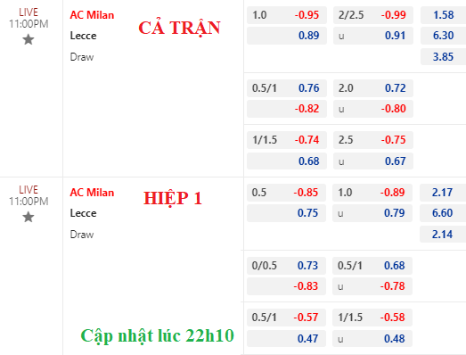Trên sàn châu Á, AC Milan vẫn chấp 1 hòa nhưng điểm ăn bỏ sâu hơn, trong khi tài xỉu 2 1/4 vốn dĩ đã thấp so với handicap lại còn chứng kiến lợi nhuận ở cửa tài tiến đến mức bỏ. Rất khó kỳ vọng vào sự cởi mở khi cửa trên không có đầy đủ những nhân tố tốt nhất ở hàng tiền đạo.