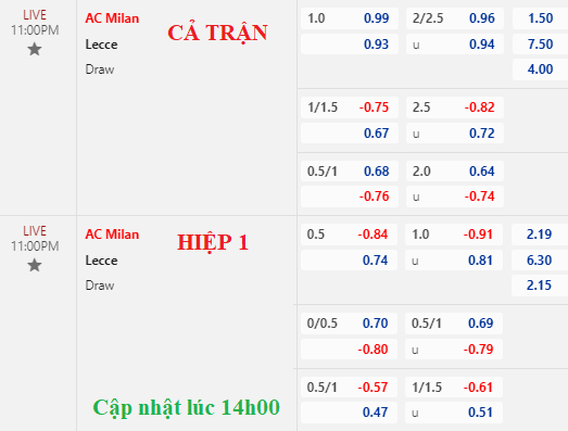 AEGoal chốt kèo bóng đá trực tiếp trận AC Milan vs Lecce diễn ra lúc 23h00 ngày 23/4 trong khuôn khổ giải VĐQG Italia sau khi dựa trên tính toán, chuyển động về kèo châu Á và đội hình ra sân của 2 đội.