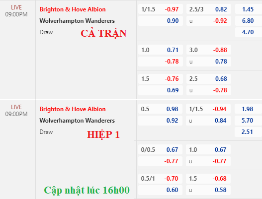 Vì thế, sàn châu Á chứng kiến đà mất giá của Brighton khi từ chấp 1 1/4 về còn chấp 1 hòa, lại còn bỏ sâu. Tài xỉu 2 3/4 ăn ít cũng được điều chỉnh thành điểm bỏ cho lựa chọn tài. Với đội hình và biến động tỷ lệ như vậy, nên tin vào cửa dưới.