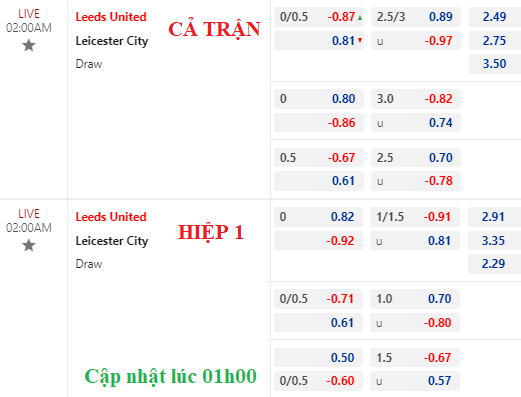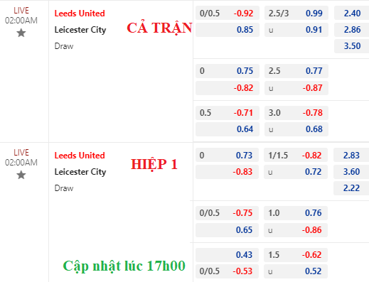 Kèo Leeds chấp đồng banh ngày càng bỏ sâu hơn khi giờ bóng lăn đến gần. Trong khi đó, tài xỉu dù vẫn là 2 3/4 nhưng điểm ăn cho cửa tài lại xuống thấp hơn thời điểm chiều qua.