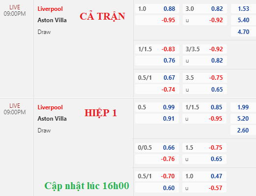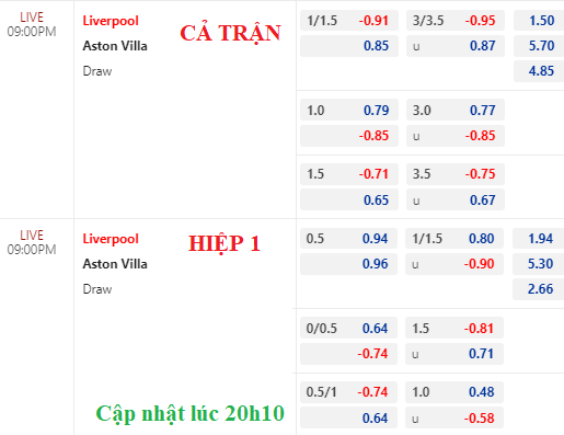 Chốt kèo trực tiếp trận Liverpool vs Aston Villa (21h00):