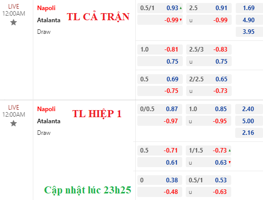Trên sàn châu Á, Napoli vẫn chấp 3/4 nhưng điểm ăn cho họ có tăng nhẹ. Đáng nói là tài xỉu 2 3/4 lại bị kéo về còn 2 1/2 với lợi nhuận không chênh lệch là bao giữa 2 cửa. Dịch chuyển như vậy cùng với việc Atalanta thận trọng thì trận này khó tưng bừng.