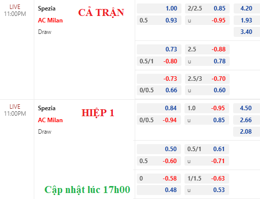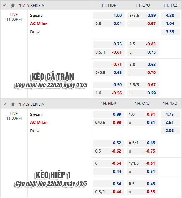 AEGoal chốt kèo bóng đá trực tiếp trận Spezia vs AC Milan diễn ra lúc 23h00 ngày 13/05/2023 trong khuôn khổ giải VĐQG Italia sau khi dựa trên tính toán, chuyển động về kèo châu Á và đội hình ra sân của 2 đội.