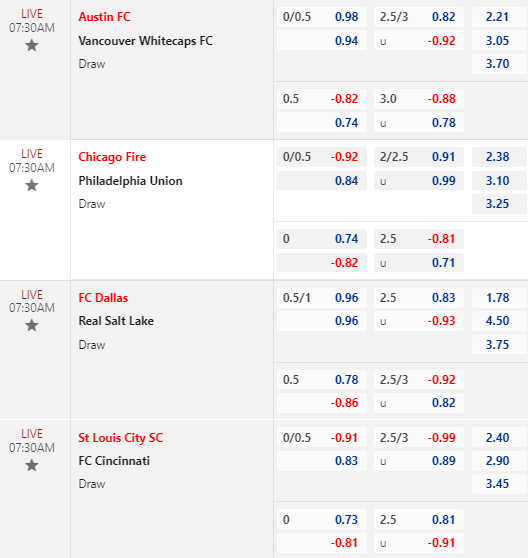 * FC Dallas vs Real Salt Lake: Chủ vẫn duy trì kèo chấp 3/4 cùng điểm bỏ, trong khi tài xỉu vẫn là 2 1/2 với điểm ăn thấp hơn cho lựa chọn tài. Dù vậy thì khả năng tấn công hạn chế của đôi bên khó mang đến hy vọng về kịch bản mở.