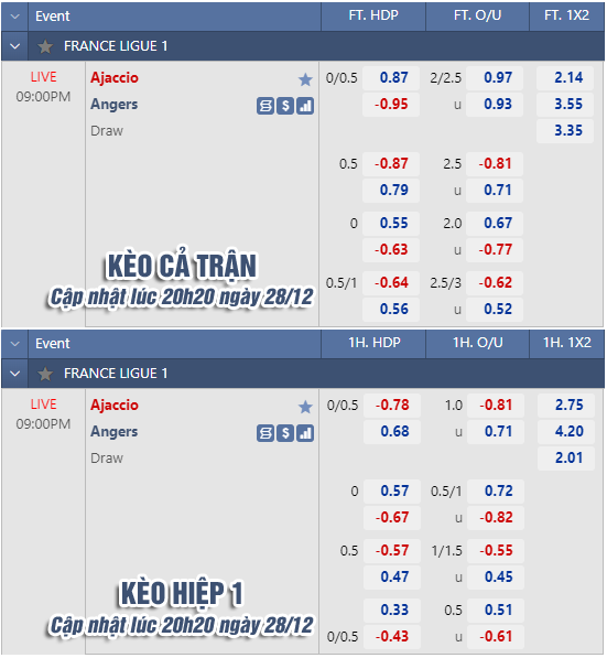 * Chốt kèo trận Ajaccio vs Angers (21h00 ngày 28/12)