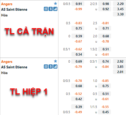 Angers vẫn đang được nhà cái châu Á đánh giá ở cửa trên với tỷ lệ chấp 1/4 như thời điểm chúng tôi cập nhật trước đây, hiện tại điểm ăn của đội chủ nhà còn được điều chỉnh giảm so với trước đây. Bên phía tỷ lệ tài xỉu cũng có những diễn biến thuận chiều khi mốc 2 1/4 vẫn được giữ như trước nhưng điểm ăn của cửa tài đang có xu hướng giảm điểm.