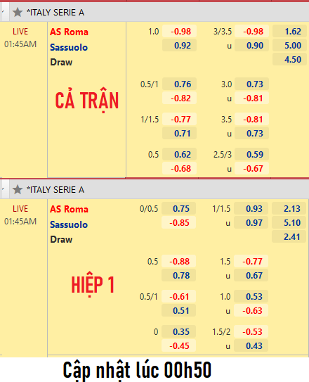 Không có biến động đáng chú ý nào trên sàn giao dịch châu Á khi AS Roma duy trì tỷ lệ chấp 1 hòa cùng lợi điểm cân bằng giữa các lựa chọn đối lập giống như thời điểm đầu phiên. Trên thực tế, đội hình xuất phát không có biến động đáng kể nào so với dự kiến khi Zaniolo, Pellegrini, Mkhitaryan và tân binh Abraham được tin tưởng trong trận đấu thứ 1000 của HLV Mourinho kể từ khi cầm quân.