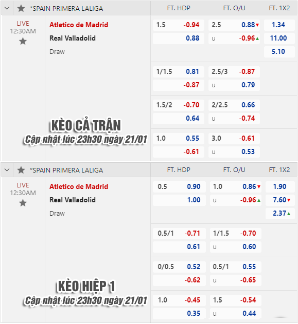 AEGoal chốt kèo bóng đá trực tiếp trận Atletico Madrid vs Valladolid diễn ra lúc 00h30 ngày 22/1 trong khuôn khổ giải VĐQG Tây Ban Nha sau khi dựa trên tính toán, chuyển động về kèo châu Á và đội hình ra sân của 2 đội.
