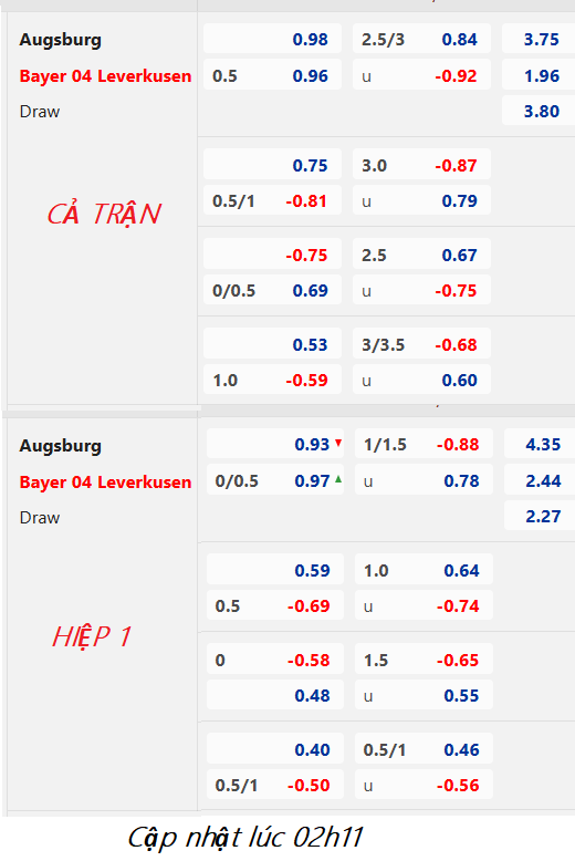 Tất nhiên diễn biến trên đang là chi tiết bất lợi dành cho cửa trên nhưng thực tế tỷ lệ hiện tại vẫn khá cao nếu nhìn vào tương quan giữa 2 đội, cũng như lợi thế sân nhà của Augsburg. Thế nên, giới phân tích vẫn chờ đợi vào chiến thắng cho Leverkusen ở trận đấu này.