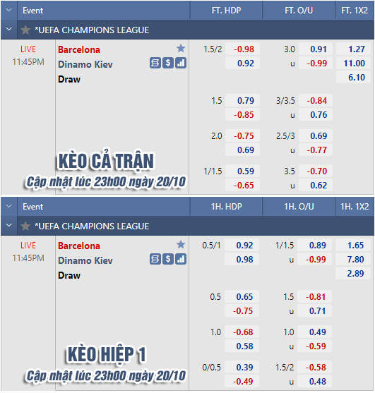 AEGoal chốt kèo bóng đá trực tiếp trận Barcelona vs Dinamo Kiev diễn ra lúc 23h45 ngày 20/10 trong khuôn khổ vòng bảng Cúp C1 châu Âu sau khi dựa trên tính toán, chuyển động về kèo châu Á và đội hình ra sân của 2 đội.