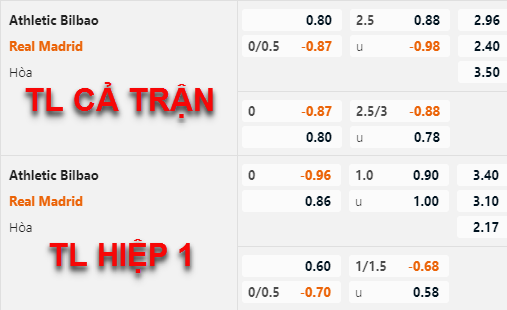 Tỷ lệ chính của trận đấu vẫn đang được nhà cái châu Á duy trì ở mức chấp 1/4 của Real Madrid như thời điểm chúng tôi cập nhật lần trước và điểm ăn của 2 cửa cũng không có nhiều thay đổi. Trong khi đó bên phía tỷ lệ tài xỉu có những thay đổi rõ rệt hơn, mốc 2 1/2 được duy trì là mốc chính của trận đấu nhưng điểm ăn của cửa tài đã được điều chỉnh tăng tương đối nhiều.