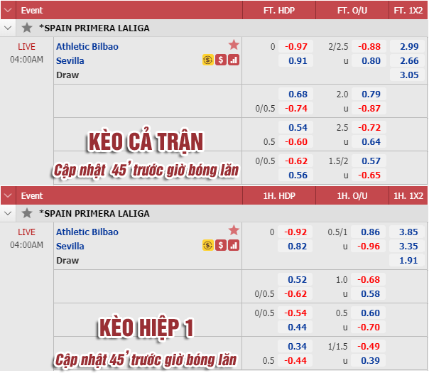 * Chốt kèo trận Bilbao vs Sevilla (03h00)