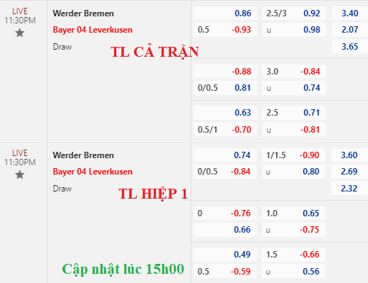 Sau thời gian giằng co quyết liệt trên sàn giao dịch châu Á, Leverkusen vẫn giữ được kèo chấp 1/4 với lợi điểm thấp hơn đáng kể và có xu hướng tiến sát lên tỷ lệ chấp 1/2 hiện nay. Đây cũng là tỷ lệ đã xuất hiện ngay từ đầu phiên khớp lệnh cuối cùng trong ngày thi đấu nên rõ ràng cuộc đấu này hứa hẹn sẽ diễn ra rất khó lường khi thành tích từ đầu mùa không có nhiều khoảng cách đáng kể nào.