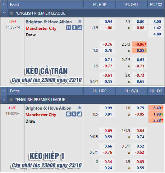 AEGoal chốt kèo bóng đá trực tiếp trận Brighton vs Man City diễn ra lúc 23h30 ngày 23/10 trong khuôn khổ giải Ngoại hạng Anh sau khi dựa trên tính toán, chuyển động về kèo châu Á và đội hình ra sân của 2 đội.