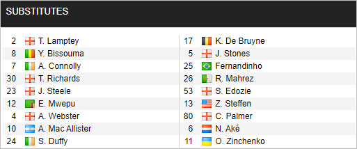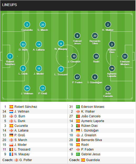 Ngoại trừ hàng công không có nhiều thay đổi thỉ ở tuyến tiền vệ và tiền đạo của Man City đã có những dịch chuyển so với thời điểm trước đó. Còn với Brighton, khá bất ngờ khi HLV Graham Potter đã quay lại sơ đồi hậu vệ 4 người ở trận này. Điều đó đang phần nào cho thấy xu hướng chơi thiên về chắc chắn của họ.