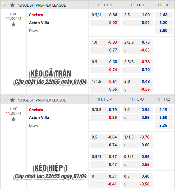 AEGoal chốt kèo bóng đá trực tiếp trận Chelsea vs Aston Villa diễn ra lúc 23h30 ngày 01/04 trong khuôn khổ giải Ngoại hạng Anh sau khi dựa trên tính toán, chuyển động về kèo châu Á và đội hình ra sân của 2 đội.