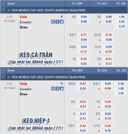 AEGoal chốt kèo bóng đá trực tiếp trận Chile vs Ecuador diễn ra lúc 07h15 ngày 17/11 trong khuôn khổ Vòng loại World Cup 2022 khu vực Nam Mỹ sau khi dựa trên tính toán, chuyển động về kèo châu Á và đội hình ra sân của 2 đội.