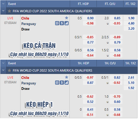 AEGoal chốt kèo bóng đá trực tiếp trận Chile vs Paraguay diễn ra lúc 07h00 ngày 11/10 trong khuôn khổ vòng loại WC 2022 khu vực Nam Mỹ sau khi dựa trên tính toán, chuyển động về kèo châu Á và đội hình ra sân của 2 đội.