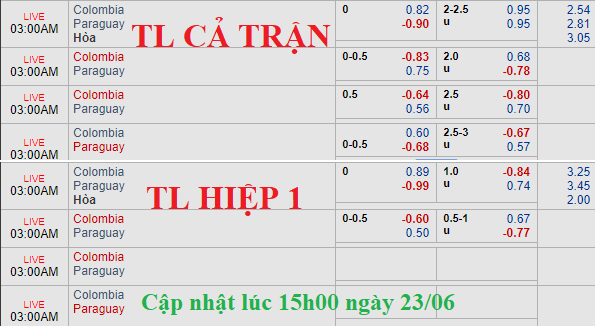 AEGoal.net chốt kèo trực tiếp trận Colombia vs Paraguay diễn ra lúc 02h00 ngày 24/06 sau khi dựa trên tính toán, chuyển động về kèo châu Á và đội hình ra sân của 2 đội.