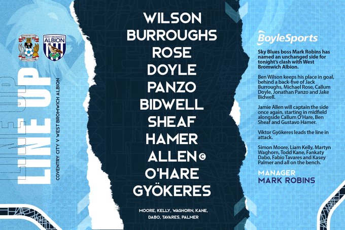 Coventry City: Ben Wilson; Michael Rose, Callum Doyle, Jonathan Panzo; Jack Burroughs, Gustavo Hamer, Ben Sheaf, Jake Bidwell; Callum O’Hare, Jamie Allen; Viktor Gyokeres.