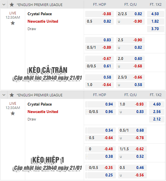 * Chốt kèo trận Crystal Palace vs Newcastle (00h30 ngày 22/1)