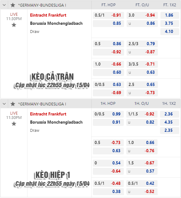 * Chốt kèo trận Eintracht Frankfurt vs Monchengladbach (23h30 ngày 15/4)