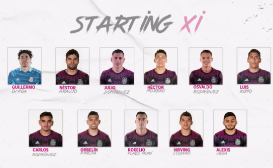 - Mexico: Ochoa; Sanchez, Montes, Araujo, Gallardo; Herrera, Alvarez, Cordova; Corona, Lozano, Jimenez.