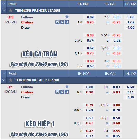 * Chốt kèo trận Fulham vs Chelsea (00h30 ngày 17/1)