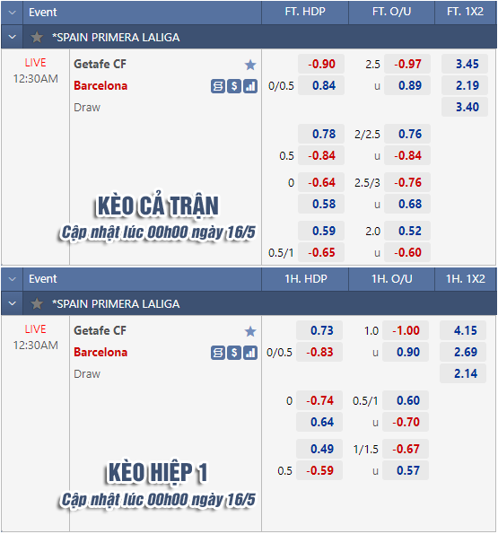 AEGoal chốt kèo bóng đá trực tiếp trận Getafe vs Barcelona diễn ra lúc 00h30 ngày 16/5 trong khuôn khổ giải VĐQG Tây Ban Nha sau khi dựa trên tính toán, chuyển động về kèo châu Á và đội hình ra sân của 2 đội.