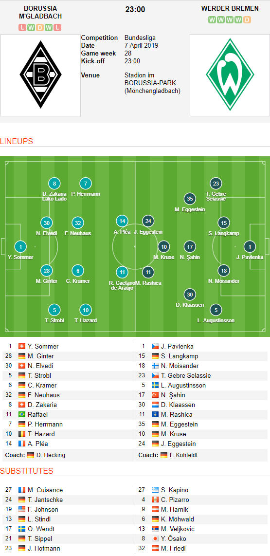 * Trong 106 lần đụng độ chính thức trước đây, Gladbach thắng 42 trận còn Bremen thắng 39 trận.