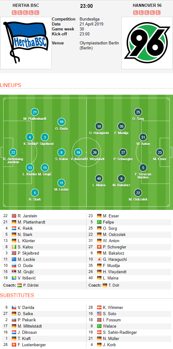 AEGoal.net chốt kèo trực tiếp trận Hertha Berlin vs Hannover diễn ra lúc 23h00 ngày 21/4 sau khi dựa trên tính toán, chuyển động về kèo châu Á và đội hình ra sân của 2 đội.