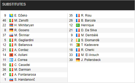 Inter Milan: Handanovic (GK), Darmian, de Virij, Bastoni, Dumfries, Barella, Mkhitaryan, Calhanoglu, Lazaro, Dzeko, Lukaku.