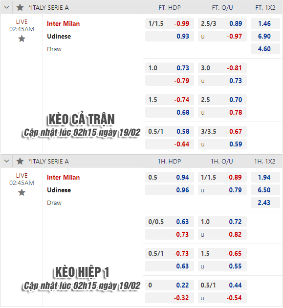 * Chốt kèo trận Inter Milan vs Udinese (02h45 ngày 19/2)