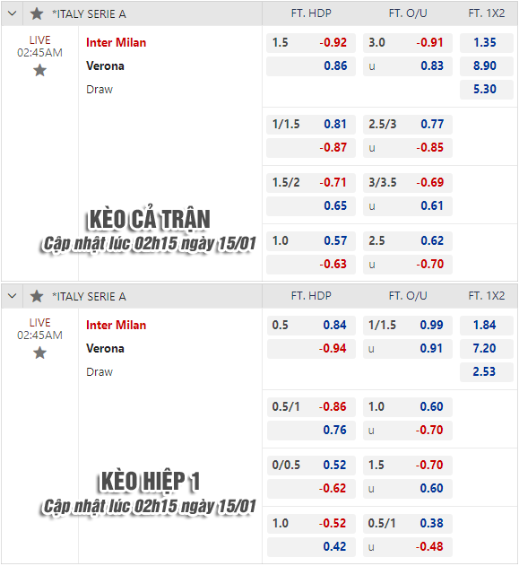 * Chốt kèo trận Inter Milan vs Verona (02h45 ngày 15/1)