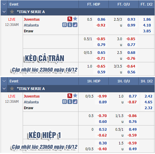 * Chốt kèo trận Juventus vs Atalanta (00h30 ngày 17/12)