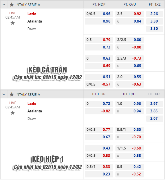 * Chốt kèo trận Lazio vs Atalanta (02h45 ngày 12/2)