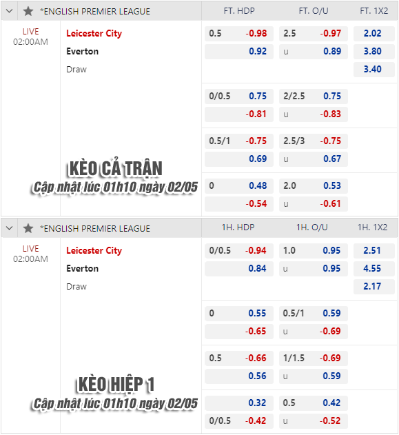 AEGoal chốt kèo bóng đá trực tiếp trận Leicester City vs Everton diễn ra lúc 02h00 ngày 2/5 trong khuôn khổ giải Ngoại hạng Anh sau khi dựa trên tính toán, chuyển động về kèo châu Á và đội hình ra sân của 2 đội.
