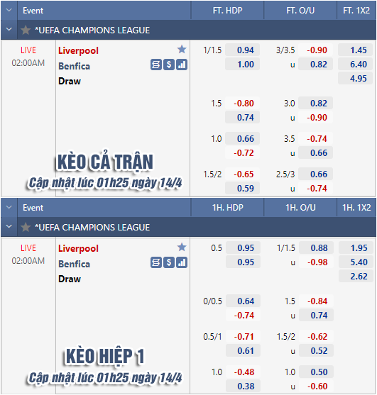 * Chốt kèo trận Liverpool vs Benfica (02h00 ngày 14/4)