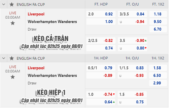 AEGoal chốt kèo bóng đá trực tiếp trận Liverpool vs Wolves diễn ra lúc 03h00 ngày 08/01/2023 trong khuôn khổ Cúp FA Anh sau khi dựa trên tính toán, chuyển động về kèo châu Á và đội hình ra sân của 2 đội.