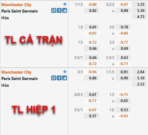 Tỷ lệ chấp của Man City có xu hướng tăng điểm thời gian vừa qua. Hiện tại tỷ lệ chấp chính của đội chủ nhà đã được nhà cái châu Á nâng lên mức 1 1/4 thay cho mức 1 hoà ở lần chúng tôi cập nhật trước. Bên phía tỷ lệ tài xỉu cũng có những diễn biến tương tự khi mốc 3 1/4 đã thay thế cho mốc 3 hoà trước đây làm mốc tài xỉu chính của trận đấu.