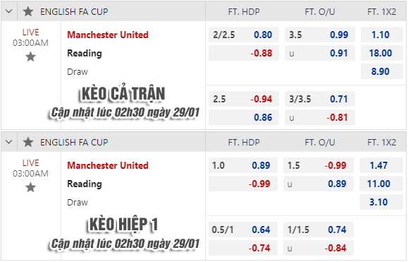 * Chốt kèo trận Man Utd vs Reading (03h00 ngày 29/1)