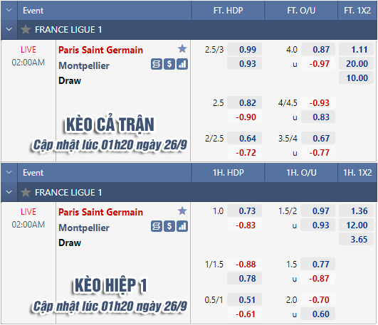 * Chốt kèo trận PSG vs Montpellier (02h00 ngày 26/9)