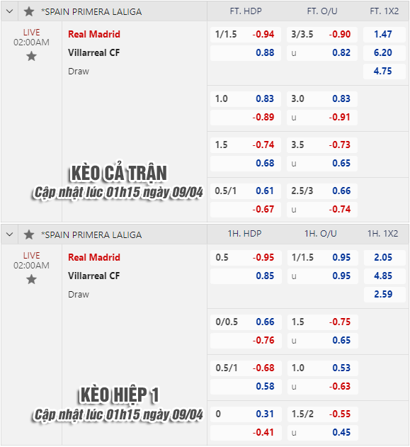 AEGoal chốt kèo bóng đá trực tiếp trận Real Madrid vs Villarreal diễn ra lúc 02h00 ngày 09/4 trong khuôn khổ giải VĐQG Tây Ban Nha sau khi dựa trên tính toán, chuyển động về kèo châu Á và Đội hình ra sân của 2 đội.