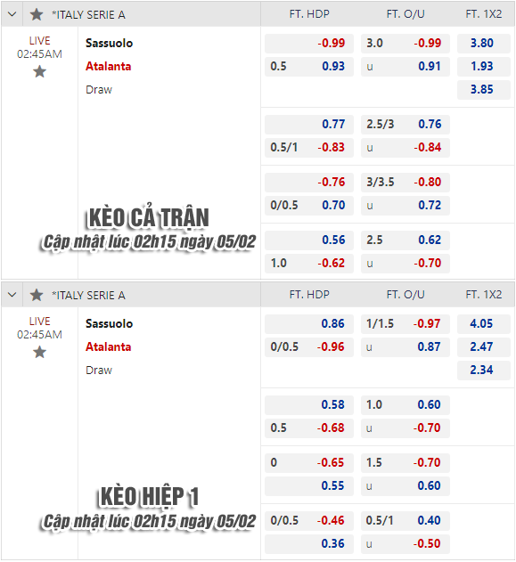 * Chốt kèo trận Sassuolo vs Atalanta (02h45 ngày 05/2)