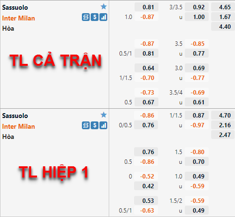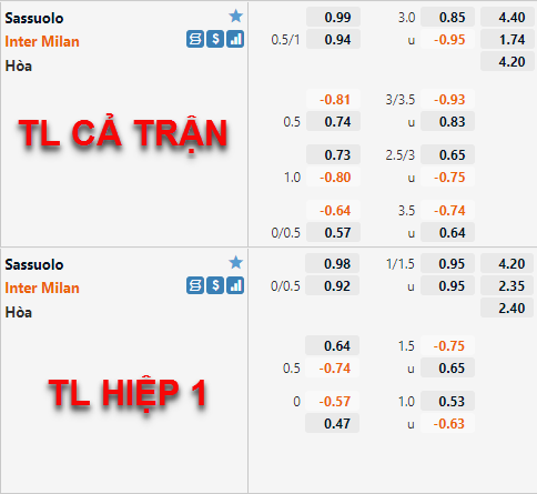 Tỷ lệ chấp của Inter Milan có xu hướng tăng điểm thời gian vừa qua. Hiện tại tỷ lệ chấp 1 hoà đang dần được đẩy lên làm tỷ lệ chính của trận đấu thay cho mức chấp 3/4 ở lần chúng tôi cập nhật trước đây. Tương tự bên phía tỷ lệ tài xỉu mốc 3 1/4 cũng đã được đẩy lên làm mốc chính của trận đấu thay cho mốc 3 hoà trước đây.