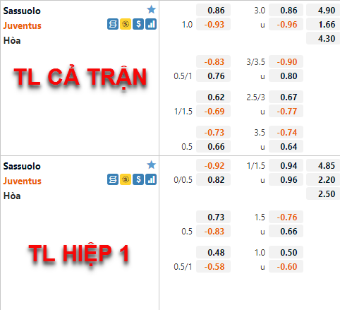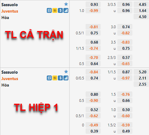 Tỷ lệ chấp của Juventus vẫn đang được nhà cái châu Á duy trì ở mức 1 hoà, điểm ăn của cửa trên đã được điều chỉnh giảm nhưng không quá nhiều. Bên phía tỷ lệ tài xỉu của trận đấu có những biến động rõ rệt hơn khi mốc 3 1/4 đã được đẩy lên là mốc chính của trận đấu thay cho mốc 3 hoà ở lần chúng tôi cập nhật trước đây.