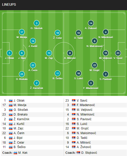 Serbia (3-4-2-1): Predrag Rajkovic, Nikola Milenkovic, Strahinja Erakovic, Strahinja Pavlovic, Darko Lazovic, Sergej Milinkovic-Savic, Nemanja Gudelj, Filip Kostic, Dusan Tadic, Nemanja Radonjic, Luka Jovic.